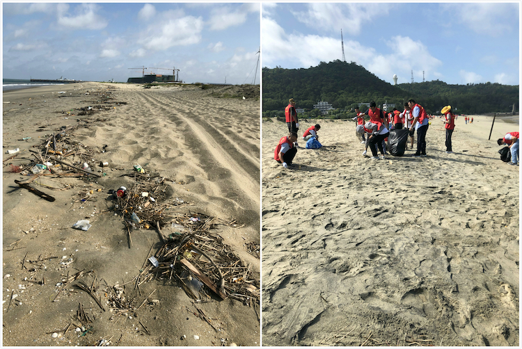 藍天下,碧海旁,蜿蜒曲折的冠頭嶺沙灘上散布的“紅馬甲”成為一道亮麗的風景。一公司志愿者們手持垃圾袋,三兩人結伴沿著海岸線撿起散落海灘的煙蒂、尼龍制品、木板、泡沫等各類垃圾。烈日下他們汗流浹背,但大家保護環境的熱情高漲本次活動共清理海岸線近1000米,清理海洋垃圾220公斤。凈灘活動結束后,志愿者們還對煙蒂、尼龍制品、木板、泡沫等垃圾進行清理和分類。
