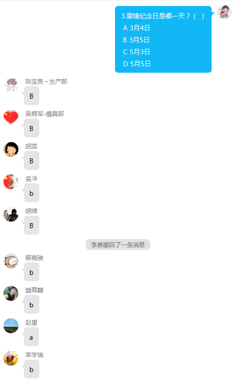 本次知識(shí)競(jìng)賽內(nèi)容涵蓋雷鋒同志的事跡、生平及榮譽(yù)。競(jìng)賽項(xiàng)目設(shè)置為單選題、多選題、填空題三個(gè)題型。團(tuán)支部在團(tuán)員群里面發(fā)送題目,題目發(fā)送后第一位答對(duì)題目的即為優(yōu)勝者。競(jìng)賽前,青年團(tuán)員們都積極熟悉雷鋒精神有關(guān)知識(shí)點(diǎn);比賽中,大家都積極答題、沉著應(yīng)對(duì)、密切配合。本次知識(shí)競(jìng)賽活動(dòng)讓青年團(tuán)員們了解了雷鋒精神,并致力將其內(nèi)化于心,外化于行,進(jìn)一步學(xué)習(xí)和弘揚(yáng)雷鋒精神。
